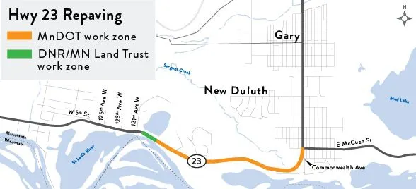 Minnesota Department of Transportation contractors will start construction on Highway 23 between Gary New Duluth and Perch Lake on May 15. Work includes pavement replacement, culvert work, guardrails, and ADA pedestrian ramps. Traffic will be reduced to one lane for the duration of the project controlled by a temporary signal system.