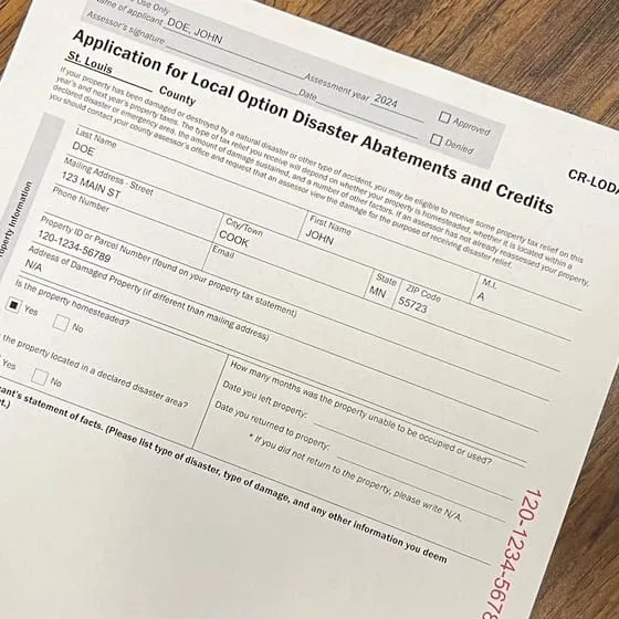 For those property owners who were absent during an assessor's visit, the county is sending out the Local Option Disaster Abatements and Credits (CR-LODA) form if the assessor identified damage warranting property tax relief. The form should be filled out and returned to the County Assessor by August 30. Property owners who have obtained this form from other sources or online should contact the County Assessor to verify they have the correct form, which includes their pre-printed property information and parcel number in red on the right side of the form.